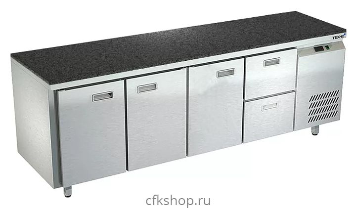 Морозильный стол Техно-ТТ СПБ/М-322/32-2206 предназначен для раскатки теста, обработки, заморозки и долговременного хранения продуктов, полуфабрикатов, напитков и мороженого на предприятиях общественного питания и торговли. Модель оснащена 3 секциями с 3 дверями и регулируемой полкой-решеткой, 1 секцией с 2 ящиками, направляющими с доводчиками (Австрия), петлями-доводчиками (Польша) и круглыми ножками, регулируемыми по высоте на 50 мм (Италия). Корпус выполнен из нержавеющей стали AISI 430, задняя стенка и дно - из оцинкованной стали, столешница - из камня.