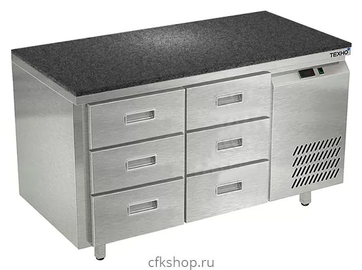 Морозильный стол Техно-ТТ СПБ/М-323/06-1306 предназначен для раскатки теста, обработки, заморозки и долговременного хранения продуктов, полуфабрикатов, напитков и мороженого на предприятиях общественного питания и торговли. Модель оснащена 2 секциями с 6 ящиками, направляющими с доводчиками (Австрия) и круглыми ножками, регулируемыми по высоте на 50 мм (Италия). Корпус выполнен из нержавеющей стали AISI 430, задняя стенка и дно - из оцинкованной стали, столешница - из камня.