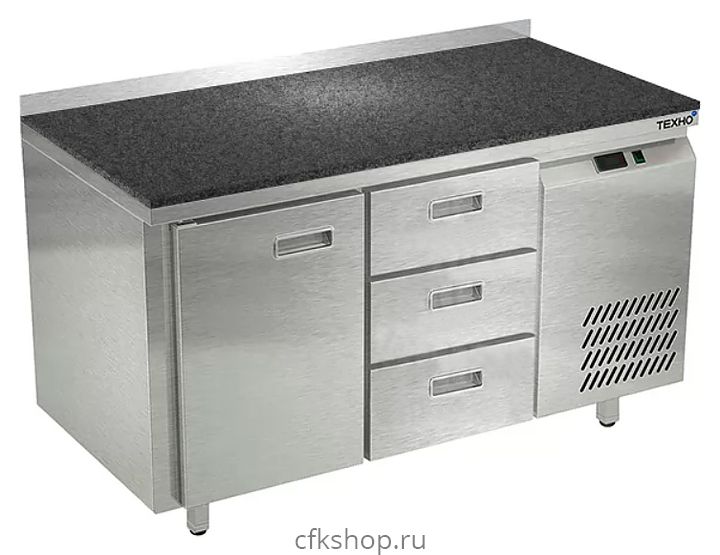 Морозильный стол Техно-ТТ СПБ/М-422/13-1306 предназначен для раскатки теста, обработки, заморозки и долговременного хранения продуктов, полуфабрикатов, напитков и мороженого на предприятиях общественного питания и торговли. Модель оснащена 1 секцией с дверью и регулируемой полкой-решеткой, 1 секцией с 3 ящиками, направляющими с доводчиками (Австрия), петлями-доводчиками (Польша), бортом и круглыми ножками, регулируемыми по высоте на 50 мм (Италия). Корпус выполнен из нержавеющей стали AISI 430, задняя стенка и дно - из оцинкованной стали, столешница - из камня.
