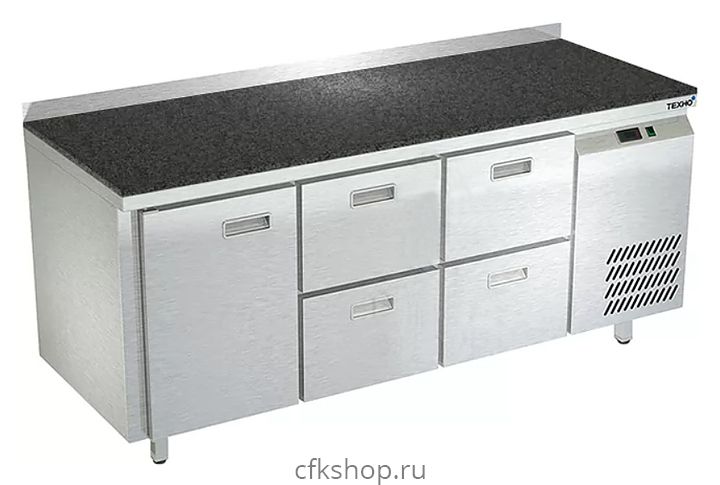 Морозильный стол Техно-ТТ СПБ/М-422/14-1807 предназначен для раскатки теста, обработки, заморозки и долговременного хранения продуктов, полуфабрикатов, напитков и мороженого на предприятиях общественного питания и торговли. Модель оснащена 1 секцией с дверью и регулируемой полкой-решеткой, 2 секциями с 4 ящиками, направляющими с доводчиками (Австрия), петлями-доводчиками (Польша), бортом и круглыми ножками, регулируемыми по высоте на 50 мм (Италия). Корпус выполнен из нержавеющей стали AISI 430, задняя стенка и дно - из оцинкованной стали, столешница - из камня.