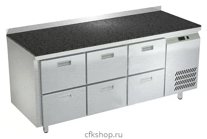 Морозильный стол Техно-ТТ СПБ/М-423/06-1807 предназначен для раскатки теста, обработки, заморозки и долговременного хранения продуктов, полуфабрикатов, напитков и мороженого на предприятиях общественного питания и торговли. Модель оснащена 3 секциями с 6 ящиками, направляющими с доводчиками (Австрия), бортом и круглыми ножками, регулируемыми по высоте на 50 мм (Италия). Корпус выполнен из нержавеющей стали AISI 430, задняя стенка и дно - из оцинкованной стали, столешница - из камня.