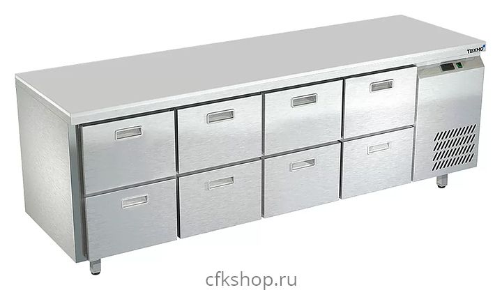 Морозильный стол Техно-ТТ СПБ/М-523/08-2206 предназначен для раскатки теста, обработки, заморозки и долговременного хранения продуктов, полуфабрикатов, напитков и мороженого на предприятиях общественного питания и торговли. Модель оснащена 4 секциями с 8 ящиками, направляющими с доводчиками (Австрия) и круглыми ножками, регулируемыми по высоте на 50 мм (Италия). Корпус выполнен из нержавеющей стали AISI 430, задняя стенка и дно - из оцинкованной стали, столешница - из полипропилена.