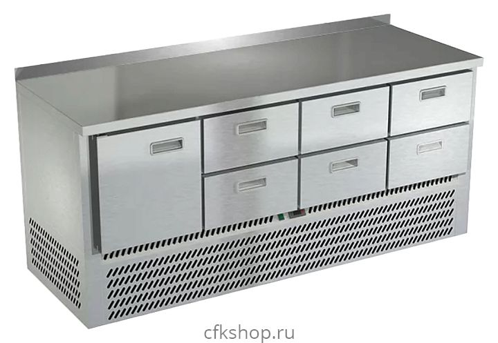 Морозильный стол Техно-ТТ СПН/М-222/16-1906 предназначен для раскатки теста, обработки, заморозки и долговременного хранения продуктов, полуфабрикатов, напитков и мороженого на предприятиях общественного питания и торговли. Модель оснащена компрессором, произведенным в Испании, 1 дверью с доводчиком (Польша), 1 регулируемой по высоте полкой-решеткой, 6 гастронормированными ящиками, направляющими с доводчиками (Австрия) и регулируемыми опорными ножками. Корпус и столешница выполнены из нержавеющей стали AISI 430, задняя стенка и дно - из оцинкованной стали.
