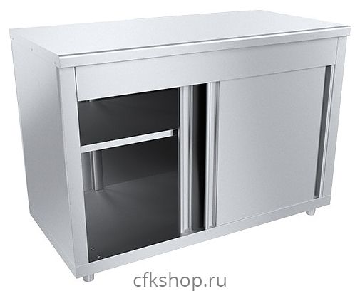 Стол Пищевые технологии СТ-К-8/7СНК предназначен для приготовления различных блюд и заготовок, хранения оборудования и инвентаря на предприятиях общественного питания и торговли. Модель оснащена прямоугольной столешницей, дверцами-купе и сплошной полкой. Столешница выполнена из нержавеющей стали AISI 430 с усилением листом ЛДСП, дверцы, боковые панели, стойки и полка - из нержавеющей стали, задняя стенка - из оцинкованной стали.