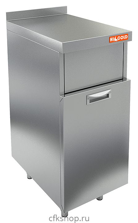 Стол под мусорный бак HICOLD НБММБ-4/6БВ используется на предприятиях общественного питания и торговли для комплектации барных стоек. Модель оснащена выдвижной секцией для мусорного бака с верхним фартуком-вертушкой. Корпус выполнен из нержавеющей стали AISI 430, столешница - из нержавеющей стали AISI 430 толщиной 1 мм и усилена ДСП.
