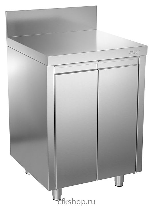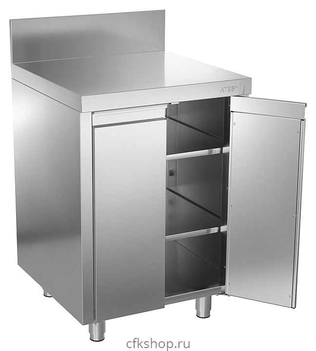 Производственный стол ATESY СТ-С-1.150-600.600-02-Р-2П серии Стандарт используется на предприятиях общественного питания и торговли для разделывания и обработки пищевых продуктов, а также в качестве вспомогательной поверхности для кухонного оборудования. Модель оснащена 2 распашными дверцами и 2 переставными полками. Изделие выполнено из легированной стали, столешница дополнительно укреплена листом ламинированной древесностружечной плиты с внутренней стороны.