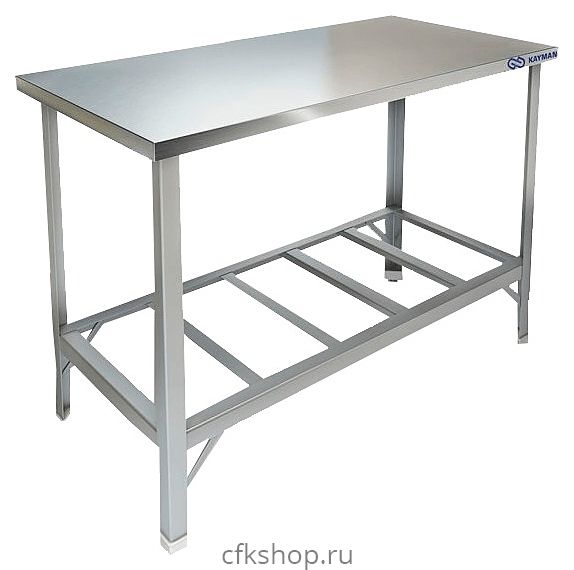 Производственный стол KAYMAN СЦ-255/1407 используется на предприятиях общественного питания и торговли для раскатки теста и обработки ингредиентов для приготовления блюд, а также как дополнительное место для установки и хранения кухонных приборов, инвентаря и сухих продуктов. Каркас - уголок из оцинкованной стали 40х40 мм, толщиной стенки 1,5 мм, полка-решетка – из оцинковки, толщиной 0,8 мм, столешница - из нержавеющей стали AISI 430, толщиной 0,8 мм, столешница усилена листом ЛДСП 16 мм.