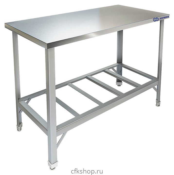 Производственный стол KAYMAN СЦ-255/1507 используется на предприятиях общественного питания и торговли для раскатки теста и обработки ингредиентов для приготовления блюд, а также как дополнительное место для установки и хранения кухонных приборов, инвентаря и сухих продуктов. Каркас - уголок из оцинкованной стали 40х40 мм, толщиной стенки 1,5 мм, полка-решетка – из оцинковки, толщиной 0,8 мм, столешница - из нержавеющей стали AISI 430, толщиной 0,8 мм, столешница усилена листом ЛДСП 16 мм.
