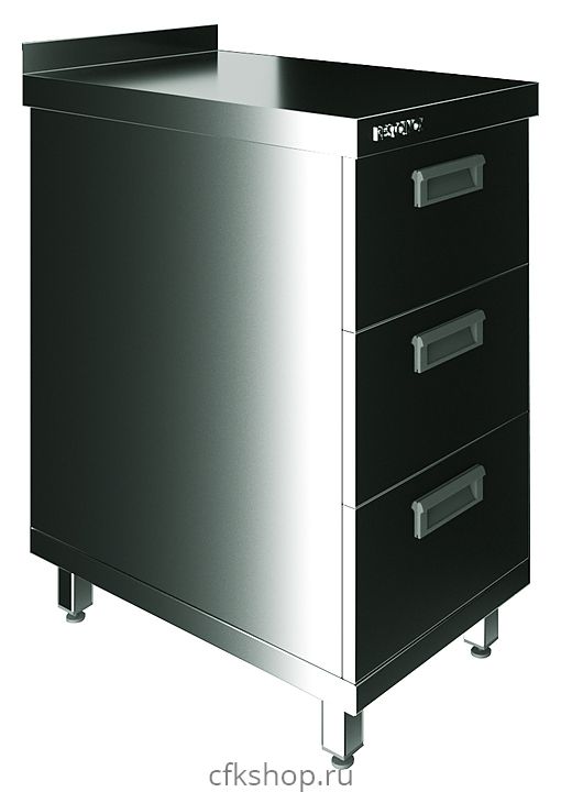 Производственный стол Restoinox СП3Я-6/6-Б предназначен для обработки продуктов питания, раскатки теста и хранения кухонного инвентаря, также для размещения малогабаритного оборудования на предприятиях общественного питания и торговли. Модель оснащена регулируемыми по высоте опорами и выдвижными ящиками. Ножки выполнены из квадратной трубы 40х40 мм из нержавеющей стали Aisi 430, корпус, рабочая поверхность и ящики - из нержавеющей стали Aisi 430, задняя стенка - из оцинкованной стали, столешница усилена листом ЛДСП.