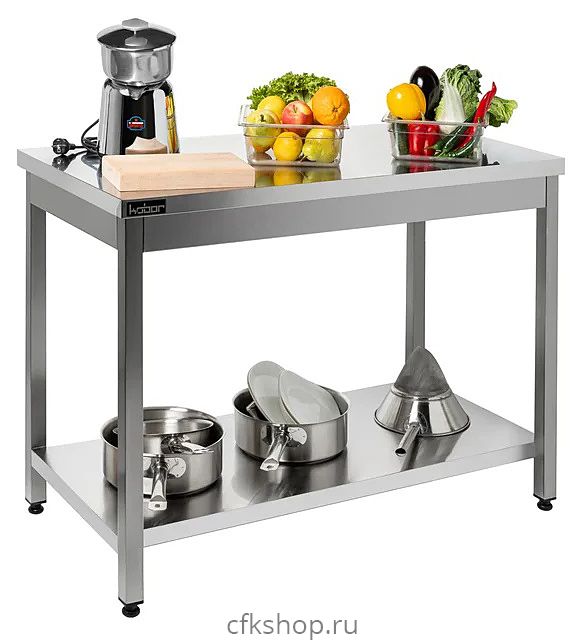 Стол Кобор СП-95/60/430 используется на предприятиях общественного питания и торговли для разделывания и обработки пищевых продуктов, а также в качестве вспомогательной поверхности для кухонного оборудования. Каркас выполнен из квадратной трубы 40х40 мм нержавеющей стали, столешница и полка - из нержавеющей стали AISI 430, столешница укреплена листом ламинированной древесностружечной плиты с внутренней стороны.