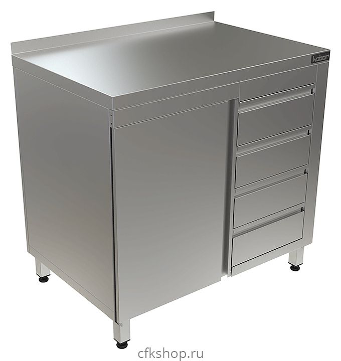 Стол-тумба Кобор СТБ/1-100/60/Р произведена из высококачественной нержавеющей стали, что позволяет использовать предмет в различных цехах. Во избежание прогибов столешница усилена листом ЛДСП толщиной 16 мм. Ножки изделия регулируются по высоте, для исключения проблем с неровным напольным покрытием, предотвращая наклон рабочей поверности.