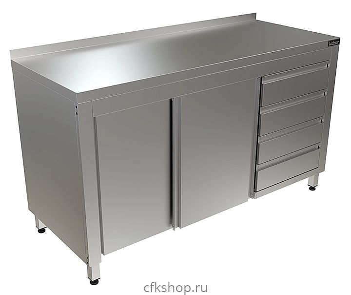 Стол-тумба Кобор СТБ/1-150/70/К произведена из высококачественной нержавеющей стали, что позволяет использовать предмет в различных цехах. Во избежание прогибов столешница усилена листом ЛДСП толщиной 16 мм. Ножки изделия регулируются по высоте, для исключения проблем с неровным напольным покрытием, предотвращая наклон рабочей поверности.