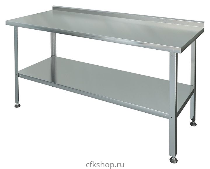 Столешница стола, усиленная подложкой из ЛДСП толщиной 15 мм,выполнена из нержавеющей стали AISI 430 толщиной 0,5 мм, каркас - из оцинкованного уголка толщиной 1+1 мм, ножки с регулиремыми опорами - из оцинкованного стального уголка 40х40 мм с подгибом краёв во внутрь толщиной 1,0 мм. Изделие оснащено практичной сплошной полкой из нержавеющей стали и одним бортом.