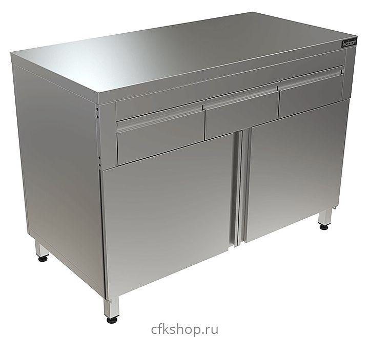 Стол для овощей Кобор СПЯ-120/70/Р имеет столешницу изготовленную из высококачественной нержавеющей стали, а также во избежание прогибов укрепленную листом ЛДСП толщиной 16 мм. Стол оснащен ящиками. Каркас стола изготовлен из нержавеющей квадратной трубы 40х40 мм, ножки регулируются по высоте позволяя избежать наклона рабочей поверхности. Товар поставляется в разобранном виде и в упаковке для облегчения транспортировки.