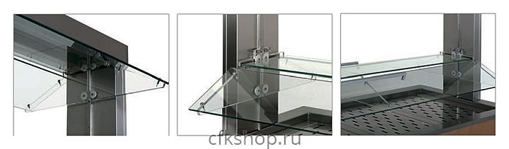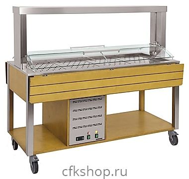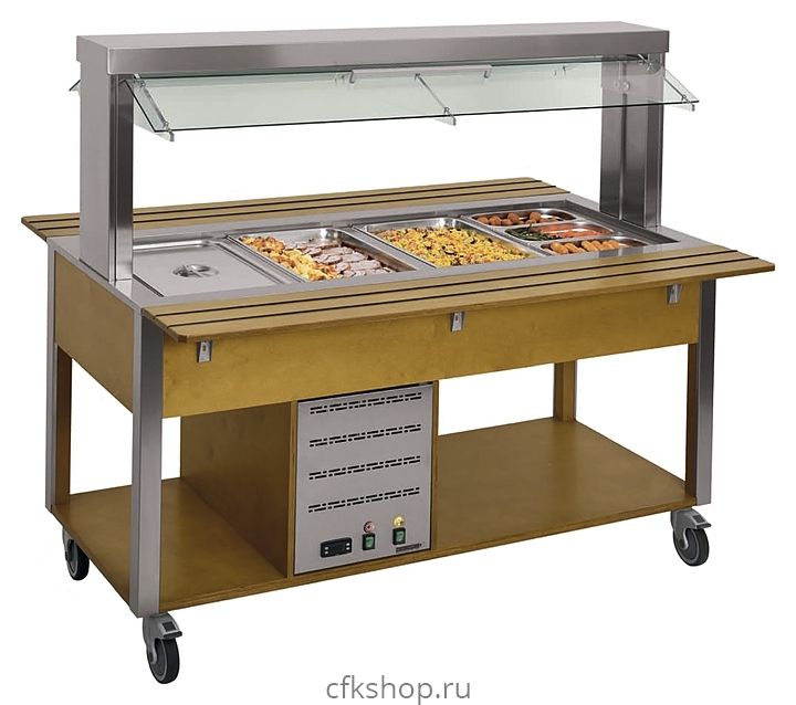 Устройство оснащено удобной в использовании панелью управления с цифровым термостатом, термометром и выключателем с сигнальной лампой. Верхняя часть стола снабжена ванной, выполненной из нержавеющей стали AISI 304, предназначенной для установки в нее нескольких гастроемкостей стандартного типа. Конструкция оснащена регулируемым по высоте козырьком из закаленного стекла, размещенным на 2 стальных опорах.