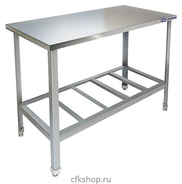 Центральный стол KAYMAN СЦ-222/1807 предназначен для использования на предприятиях общественного питания и торговли для раскатки теста и обработки ингредиентов для приготовления блюд, а также как дополнительное место для установки и хранения кухонных приборов, инвентаря и сухих продуктов. Модель оснащена полкой-решеткой. Каркас - уголок из оцинкованной стали 40х40 мм, толщиной стенки 1,5 мм, полка-решетка – из оцинковки, толщиной 0,8 мм, столешница - из нержавеющей стали AISI 430, толщиной 0,8 мм, столешница усилена листом ЛДСП 16 мм.