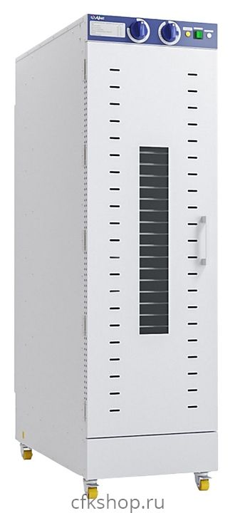 Дегидратор Abat ШС-32-1-01 предназначен для сушки трав, фруктов, овощей, ягод, макаронных изделий, мясных продуктов, приготовления пастилы и йогурта на предприятиях общественного питания и торговли. Модель оснащена электромеханической панелью управления, ТЭН-ами различной мощности, 4 вентиляторами и колесами с функцией стопорения. Корпус выполнен из окрашенного металла.