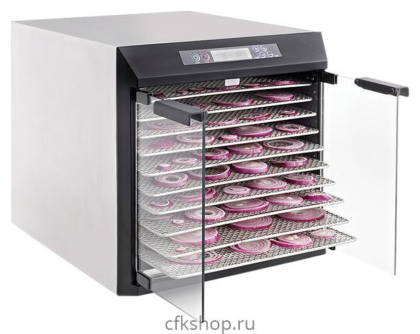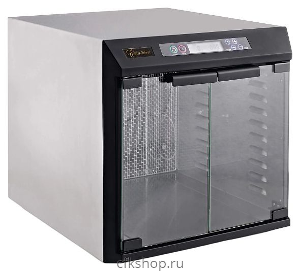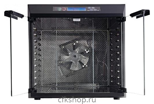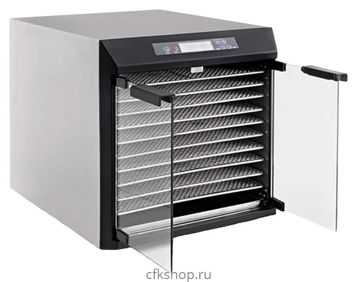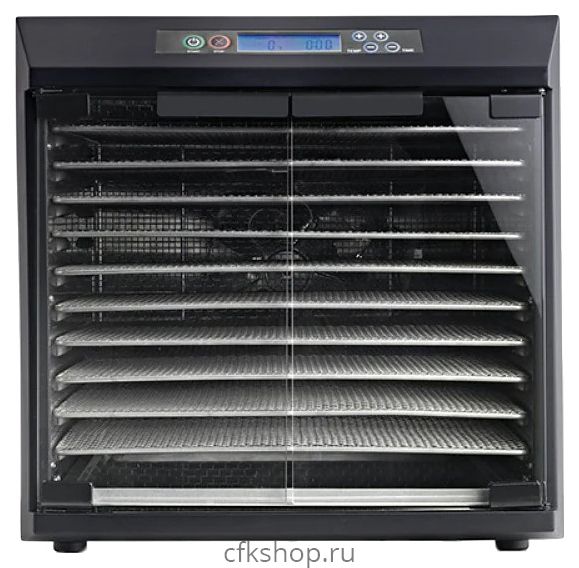Дегидратор Excalibur EXC10ELF предназначен для сушки овощей, фруктов, ягод, орехов, грибов и трав, расстойки теста, приготовления йогурта, вяления мяса и рыбы на предприятиях общественного питания и в домашних условиях. Модель оснащена расположенными в задней стенке нагревательным элементом и вентилятором, электронным термостатом, распашными дверьми и кнопочной панелью управления с жидкокристаллическим дисплеем. Корпус, внутренняя облицовка камеры, лотки и поддон выполнены из высококачественной нержавеющей стали, фронтальная панель – из пластика черного цвета, двери – из армированного стекла.