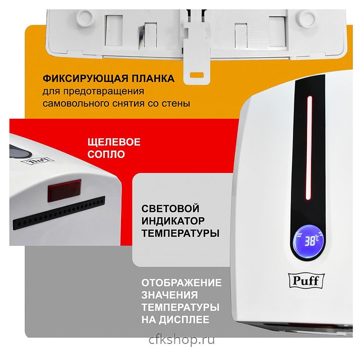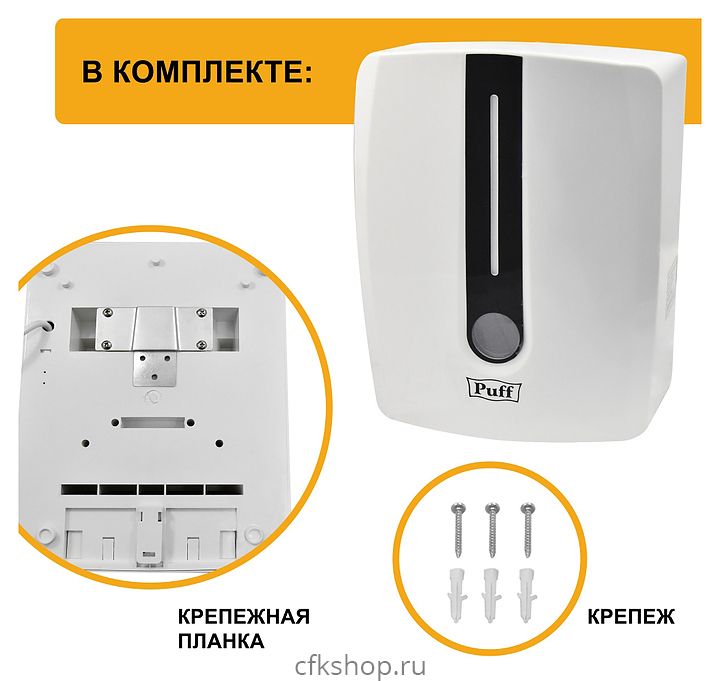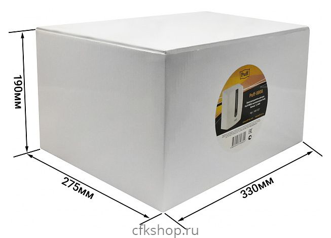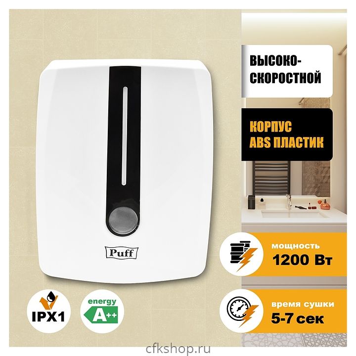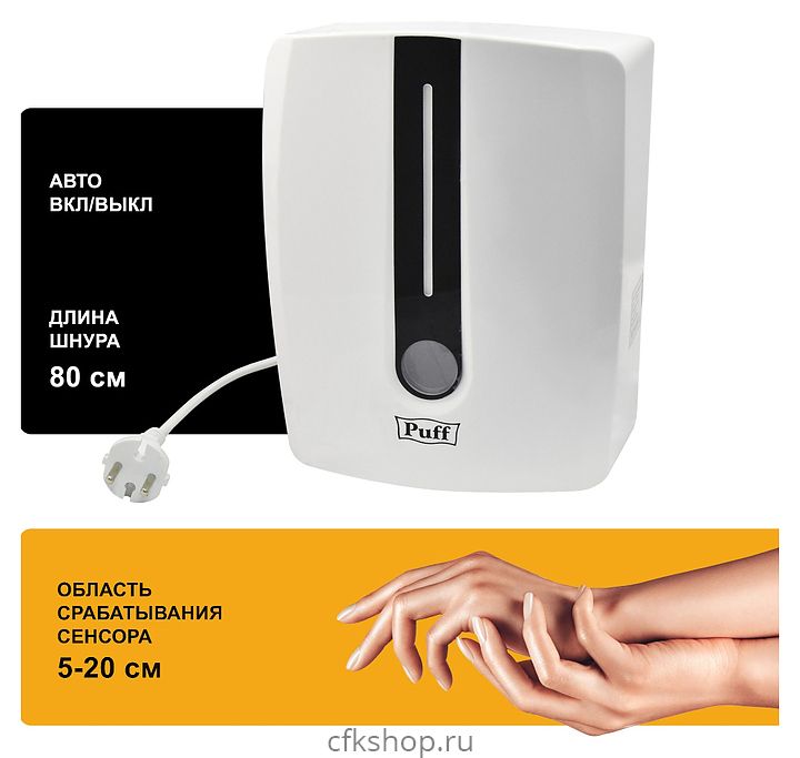 Сушилка для рук Puff 8808 используется в гостиницах, отелях, бассейнах, фитнес-клубах и спа-центрах. Прибор оснащен сенсорным управлением и бережным высушиванием, при котором на руки подается сначала горячий воздух, далее теплый, и далее холодный, что способствует сохранению природного коллагена кожи рук. Щелевое сопло позволяет размещать для высушивания обе раскрытые ладони. Корпус выполнен из прочного ABS-пластика.