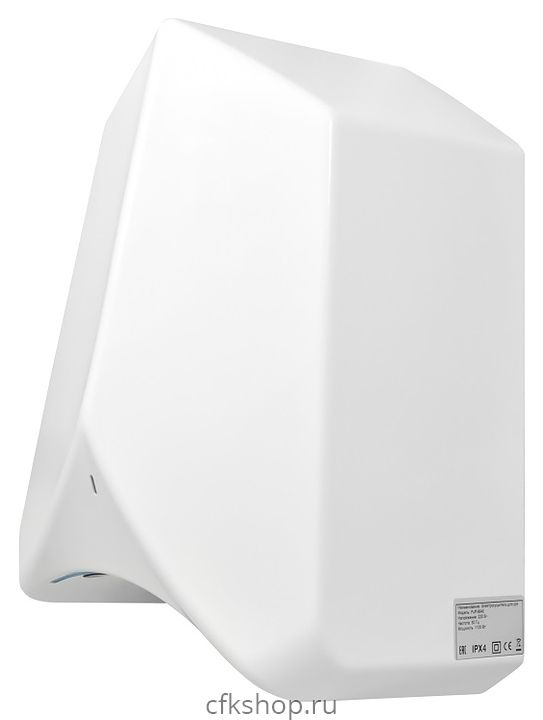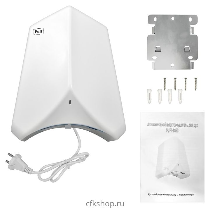 Сушилка для рук Puff 8840 используется в туалетных комнатах торговых центров, гостиниц, аэропортов, предприятий общеcтвенного питания и других местах массового пребывания для бесконтактной гигиеничной сушки. Модель оснащена 2 нагревательными элементами, электродвигателем с вентилятором и кабелем питания с вилкой. Корпус выполнен из ударопрочного АБС-пластика белого цвета.