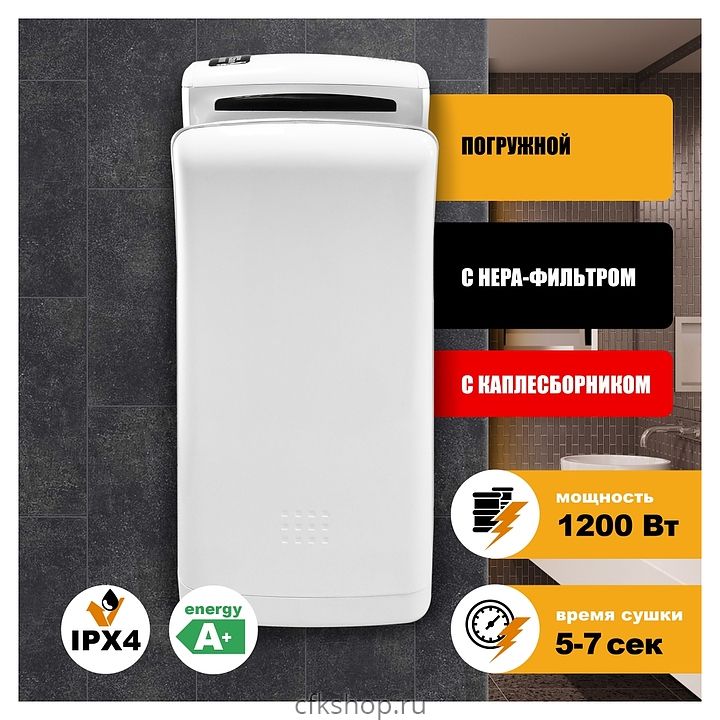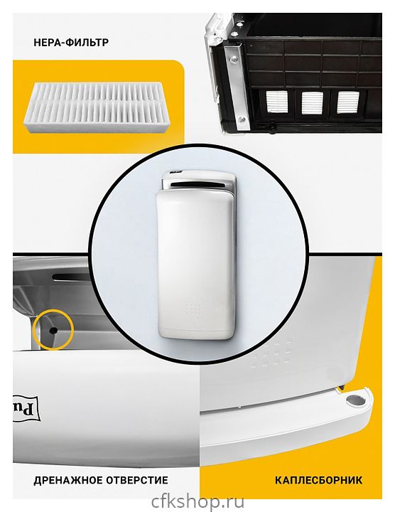 Сушилка для рук Puff 8850 используется в гостиницах, отелях, бассейнах, фитнес-клубах и спа-центрах. Прибор оснащен сенсорным управлением, HEPA-фильтром для задерживания мелкодисперсных частиц и каплесборником. Корпус выполнен из прочного ABS-пластика.