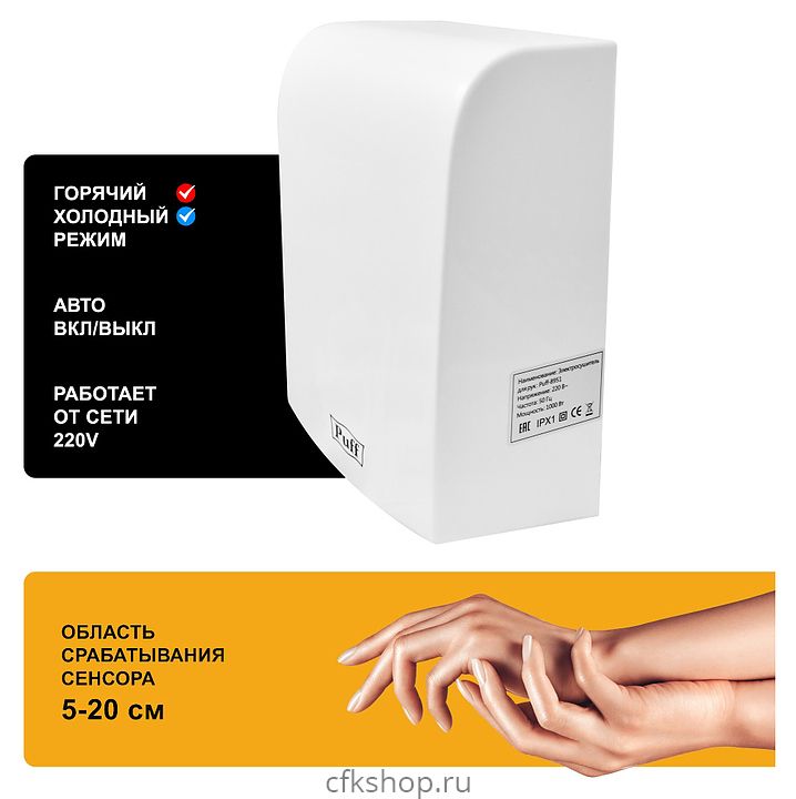 Сушилка для рук Puff 8951 используется в гостиницах, отелях, бассейнах, фитнес-клубах и спа-центрах. Прибор оснащен сенсорным управлением, автоматическим включением и выключением, а также НЕРА фильтром для защиты воздушного потока от вредоносных бактерий. Корпус выполнен из прочного ABS-пластика.