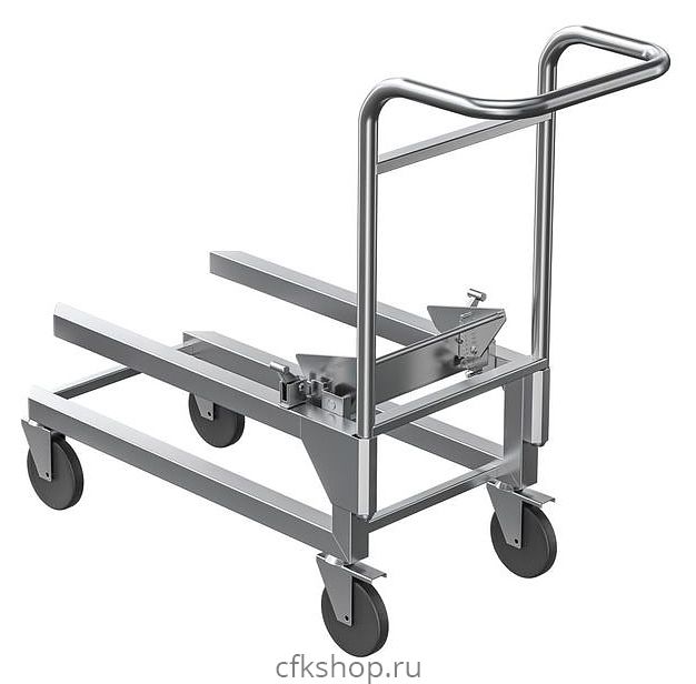 Тележка KAYMAN ТСШ-01-20-И А используется на предприятиях общественного питания и торговли для перемещения и установки в пароконвектомат ПКЭ-20-И А стеллажа-шпильки СШ-01-20-И А. Модель оснащена механизмом фиксации стеллажа-шпильки и съемной ручкой. Изделие выполнено из нержавеющей стали AISI 304, колеса - обрезиненные.