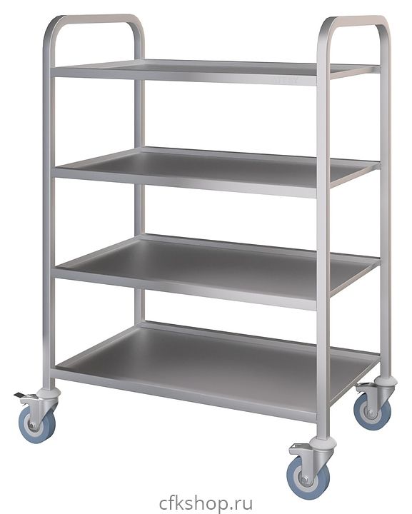 Сервировочная тележка ATESY ТС-Л-4-1100.600.1100-02 серии Люкс используется на предприятиях общественного питания для перемещения готовых блюд, напитков и посуды в зал приема пищи, а также для подачи грязной посуды из зала в моечное отделение. Модель оснащена 4 вместительными полками с бортиками и 4 поворотными колесами, 2 из которых с тормозом. Полки и стойки выполнены из нержавеющей стали AISI 304, рамы - из нержавеющей трубы AISI 304 сечением 25х25 мм.