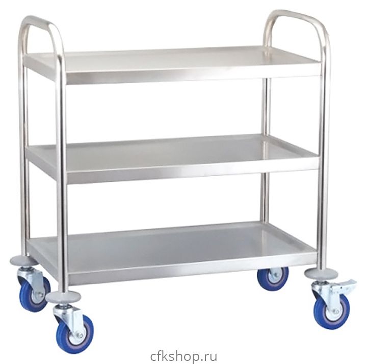 Сервировочная тележка CuisinAid CD-RST3B используется на предприятиях общественного питания для транспортировки готовых блюд, напитков и посуды в зал приема пищи, а также грязной посуды из зала в моечное отделение. Модель оснащена 3 полками с бортиками и 2 дугообразными поручнями. Полки выполнены из нержавеющей стали, каркас – из профиля трубы круглого сечения из нержавеющей стали.