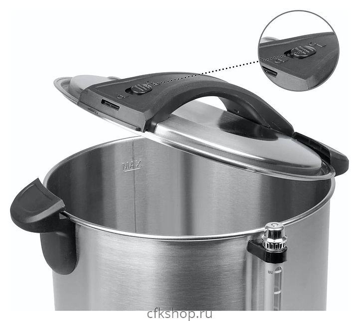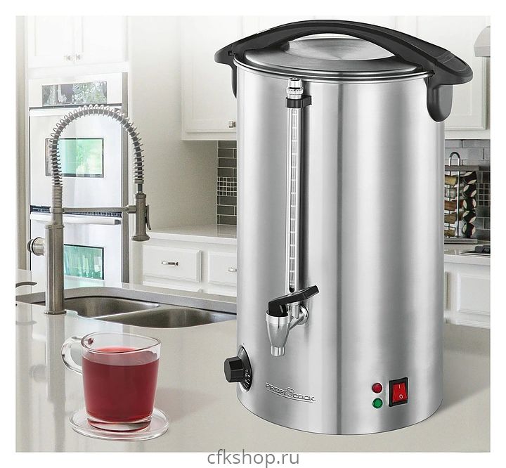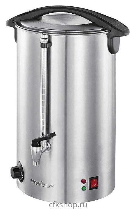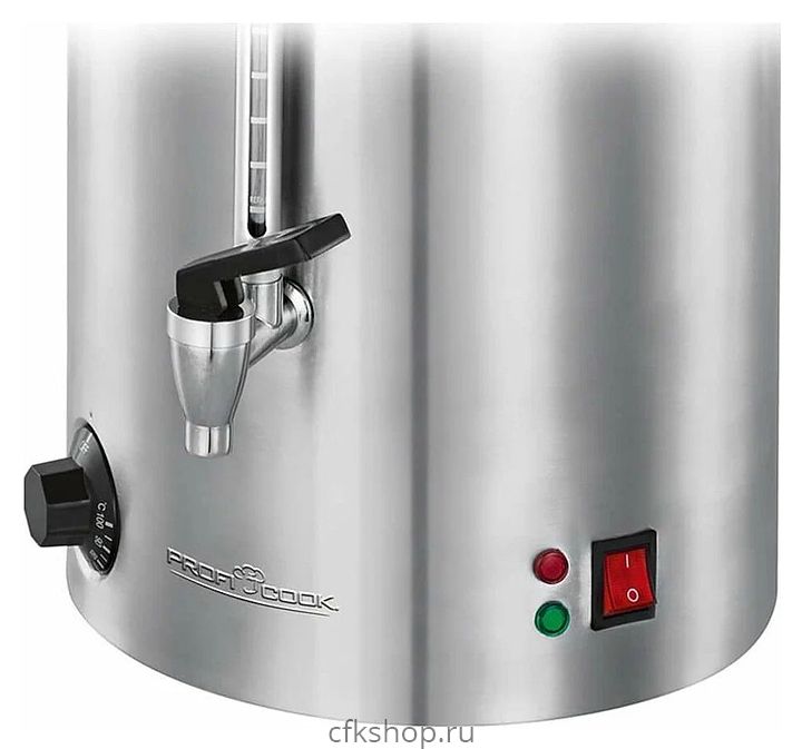 Термопот Profi Cook PC-HGA 1111 используется в квартирах, частных домах, кафе и ресторанах для нагрева и поддержания тепла большого количества воды или горячих напитков. Модель оснащена терморегулятором, 2 световыми индикаторами, запирающейся крышкой с термоизолированной ручкой и съемным сливным краном. Корпус и нагревательный элемент выполнены из нержавеющей стали, кран - цельнометаллический хромированный, ручки - из пластика.