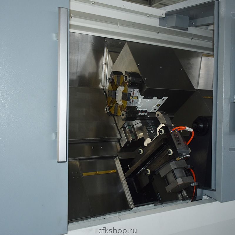 Конструкция наклонной станины с углом наклона 45 градусов повышает точность станка, способствует более эффективной работе оператора во время установки оснастки, а также оптимизирует отвод стружки и подачу охлаждающей жидкости.