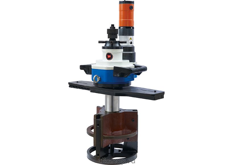 Переносные фаскосниматели серии P3-PG для обработки торцов труб диаметром 16-1470 мм. Агрегаты позволяют снимать фаску с наружней и внутренней кромки, выполнять торцевание и расточку внутреннего диаметра. Процесс обработки кромки (снятия фаски или торцевания) осуществляется следующим образом: вращением маховика происходит разведение кулачков, при этом фаскосниматель закрепляется на внутренней поверхности трубы. Агрегат сам центрируется и выравнивается. Для торцевания кромки в резцедержатель зажимаются торцовочные резцы (90 град.). После включения двигателя, резцы подводятся плавным вращением маховика вручную. После выравнивания кромки, оператор разводит резцы, выключает аппарат и снимает его с трубы. Для снятия фаски (наружней или внутренней) необходимо установить фасочные резцы с требуемым углом. Фаску можно снять полностью или оставить необходимое претупление. Для одновременного выполнения операций по торцеванию и снятию фаски, необходимо закрепить в один резцедержатель фасочный резец, а во второй торцовочный резец. Чтобы за один проход снять фаску и выровнять торцовую поверхность под претупление, для этого фасочный резец выставляется с опережением торцовочного на необходимую величину. Модельный ряд фаскоснимателей для труб P3-PG представлен несколькими моделями, для труб диаметром от 20 до 1470 мм, с толщиной стенки до 75 мм