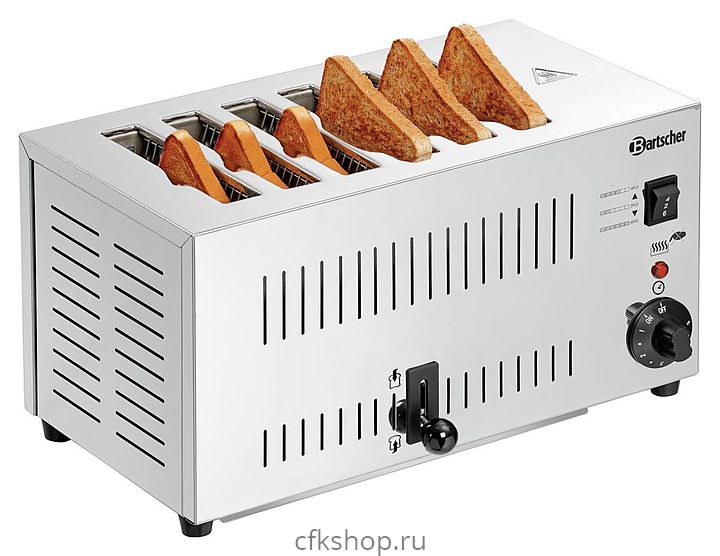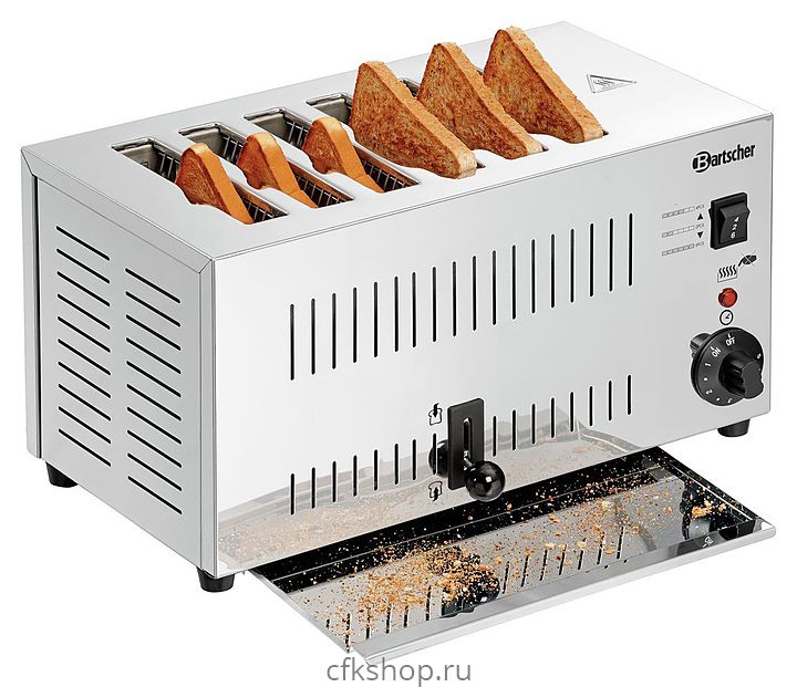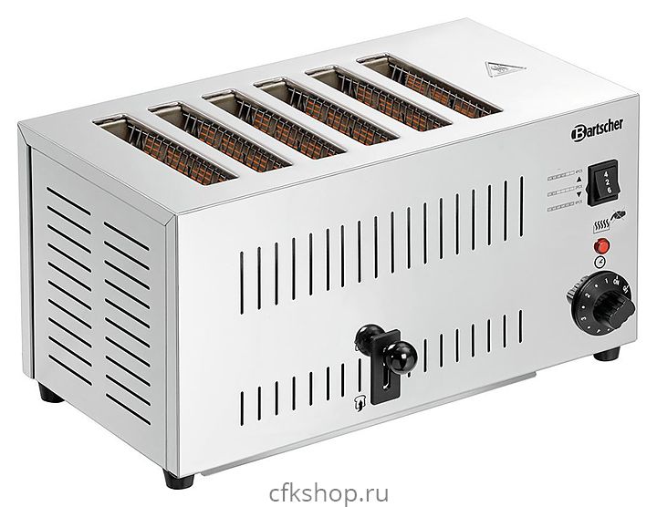 Тостер Bartscher TS60 предназначен для поджарки и разогрева кусочков хлеба, сэндвичей и булочек на предприятиях общественного питания и торговли. Модель оснащена рычагом управления для 6 пазов и вынимаемым поддоном для крошек. Корпус выполнен из нержавеющей стали.