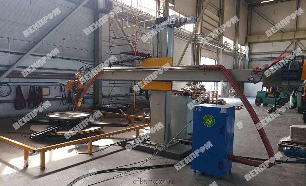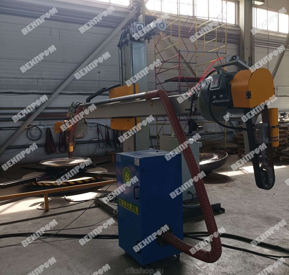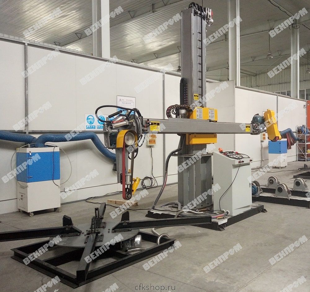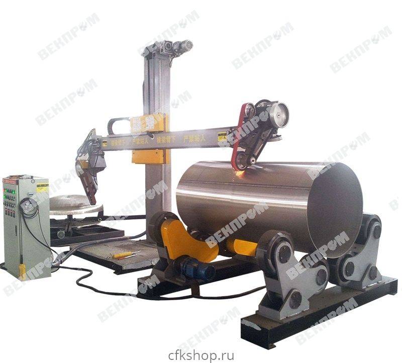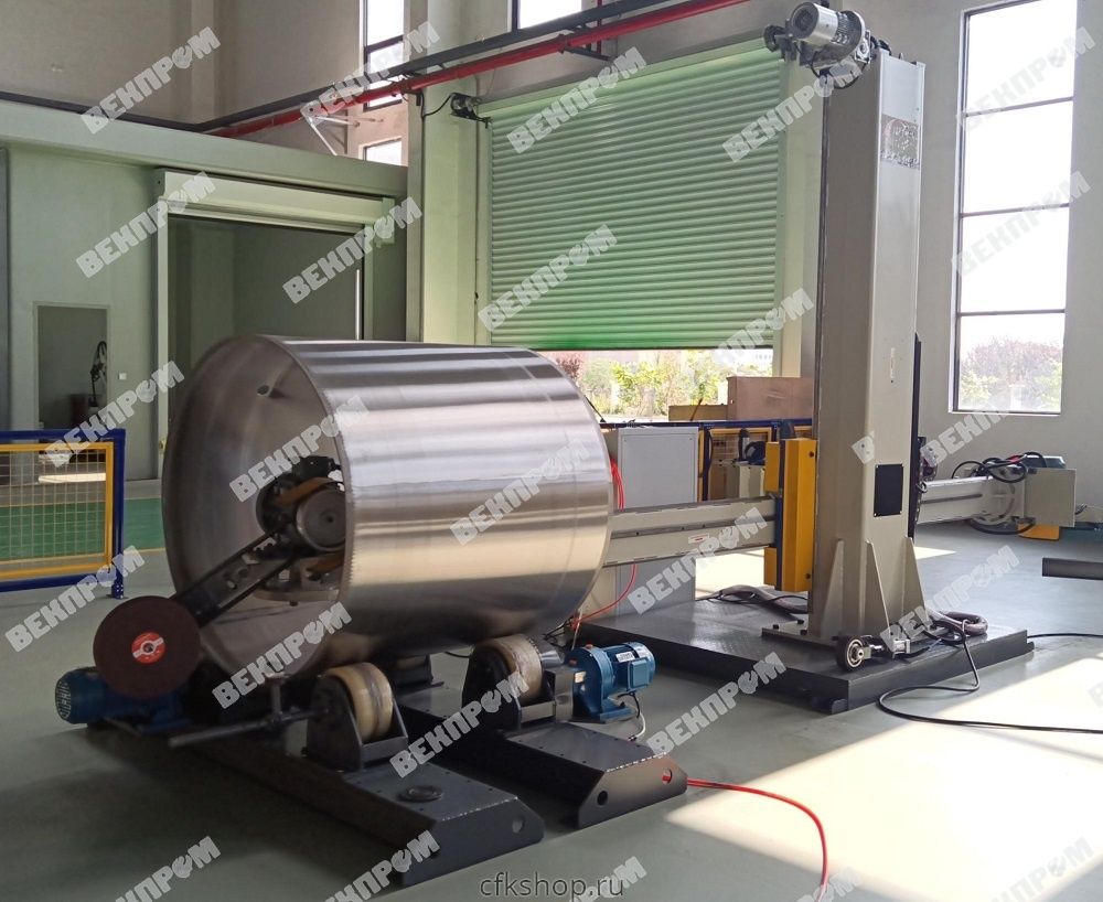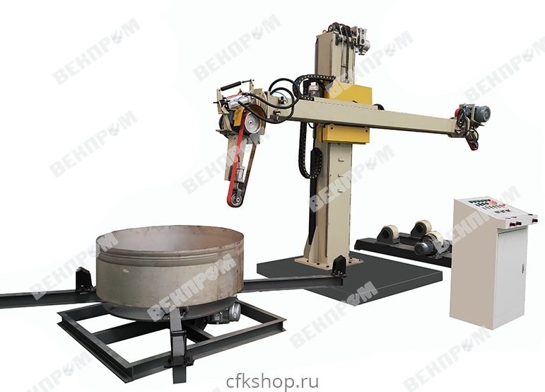 Установка для шлифовки и полировки обечаек, корпусов и днищ, цистерн представляет собой комплекс оборудования, состоящий из колонны-манипулятора, роликовых вращателей, поворотного стола, двух шлифовальных головок, шкафа управления. На конце горизонтальной консоли колонны монтируются шлифовальные плавающие головки. Шлифовальные головки оснащены пневматическим устройством прижима и регулировки давления. Горизонтальная консоль имеет регулируемую скорость перемещения по вертикали и горизонтали. Для горизонтального перемещения консоли используется механизм рейка-звездочка, для вертикального – цепь-звездочка. Механизм перемещения консоли по вертикали оснащен противовесом и устройством против падения. Наклон головки относительно обрабатываемой поверхности задается с помощью пневмоцилиндров. Они же осуществляют регулируемый поджим рабочего инструмента к обрабатываемому изделию. Пневмоцилиндр также используется для натяжения шлифовальной ленты. Шлифовальная головка позволяет использовать как шлифовальные ленты, так и различные шлифовальные/полировальные круги. Замена шлифовальной ленты осуществляется очень быстро путём установки приводных ремней для вращения шкива, на котором закрепляется шлифовальный круг. Для шлифовки внутренней поверхности обечаек диаметром 300-800 мм к двигателю головки подсоединяется специальная штанга длиной 1,2 м, на которую устанавливаются шлифовальные диски (дополнительная опция).