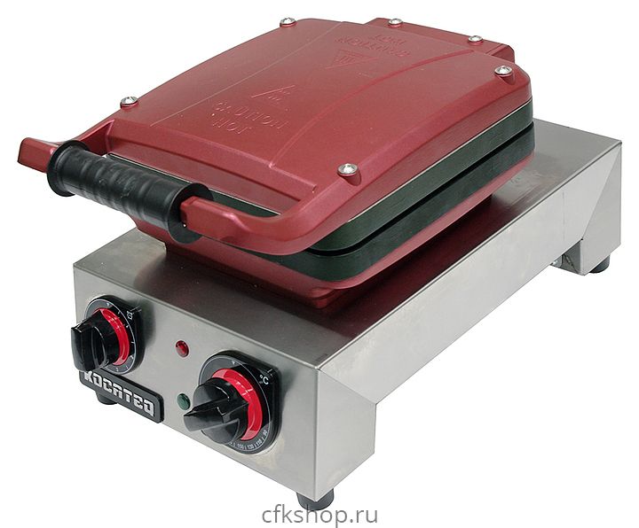 Вафельница Kocateq GH15TWI используется на предприятиях общественного питания и торговли, в пекарнях и кондитерских для выпекания вафель. Модель оснащена откидной верхней пластиной с ручкой, панелью управления со светодиодными лампами индикации и пластиковыми ножками. Корпус выполнен из сплава алюминия с антипригарным покрытием бордового цвета, основание и лоток - из нержавеющей стали AISI 304.