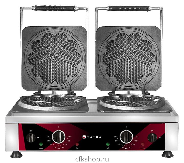 Вафельница Tatra TWI 2 AMORE предназначена для выпечки вафель в форме сердца на предприятиях общественного питания и торговли. Модель оснащена электромеханической панелью управления с терморегулятором, 2 зонами выпечки с независимым управлением, емкостью для сбора жира и индикаторами питания и нагрева. Корпус выполнен из нержавеющей стали, несъемные рабочие поверхности - из чугуна.