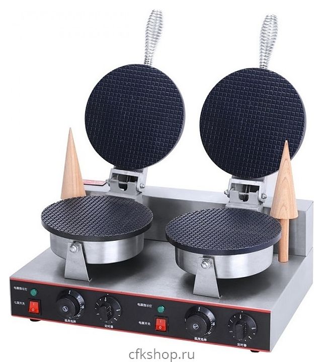 Вафельница Hualian HCB-2 используется на предприятиях общественного питания и торговли для выпекания тонких вафель круглой формы. Модель оснащена 2 независимыми рабочими секциями, 2 откидными крышками с рельефными рукоятками, 2 пъедесталами и электромеханической панелью управления. Корпус выполнен из нержавеющей стали, жарочные поверхности – из чугуна с антипригарным тефлоновым покрытием, накладка на рукоятке – из термостойкого пластика. Корпус выполнен из нержавеющей стали, жарочные поверхности – из чугуна с антипригарным тефлоновым покрытием, конусы – из дерева.