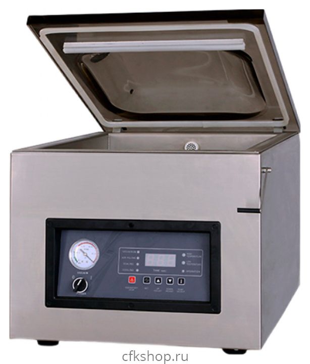 Настольный вакуумный упаковщик Hualian DZ-400T используется на предприятиях общественного питания и торговли, а также в домашних условиях для упаковки готовых блюд и пищевых продуктов в герметичную тару для сохранения свежести, предотвращения размножения микроорганизмов и смешивания запахов. Модель оснащена вакуумным насосом, объемной камерой с 1 продольно ориентированной запаечной планкой, расположенной сверху откидной крышкой выпуклой формы с эластичными манжетой по периметру и прижимным уплотнением, панелью управления с мембранной клавиатурой и светодиодным цифровым дисплеем. Корпус и камера выполнены из нержавеющей стали, крышка – из высокопрочного органического стекла, расходные материалы запаечной планки – тефлоновое полотно и нихромовая лента.