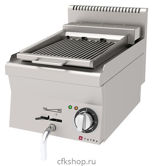Водяной гриль (вапо-гриль) Tatra TWG 2735 предназначен для приготовления мяса, рыбы и овощей с поджаристой корочкой снаружи и мягкой текстурой внутри на предприятиях общественного питания и торговли. Благодаря косвенному нагреву от инфракрасных ТЭНов и испарению воды сохраняется мягкость и цвет продуктов. Модель оснащена механической панелью управления с терморегулятором и встроенным резервуаром для воды. Корпус и рабочая поверхность выполнены из нержавеющей стали, устойчивой к высоким температурам и интенсивной нагрузке.