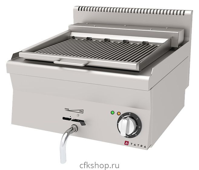 Водяной гриль (вапо гриль) Tatra TWG 4635 предназначен для приготовления мяса, рыбы и овощей с поджаристой корочкой снаружи и мягкой текстурой внутри на предприятиях общественного питания и торговли. Благодаря косвенному нагреву от инфракрасных ТЭНов и испарению воды сохраняется мягкость и цвет продуктов. Модель оснащена механической панелью управления с терморегулятором и встроенным резервуаром для воды. Корпус и рабочая поверхность выполнены из нержавеющей стали, устойчивой к высоким температурам и интенсивной нагрузке.