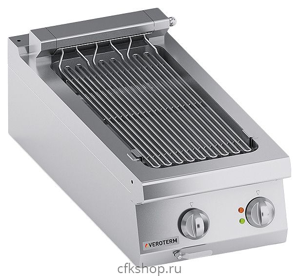 Настольный электрический водяной гриль (вапо-гриль) VEROTERM VT4GDEP05TT предназначен для приготовления мяса, рыбы и овощей с поджаристой корочкой снаружи и мягкой текстурой внутри на предприятиях общественного питания и торговли. Благодаря косвенному нагреву от инфракрасных ТЭНов и испарению воды сохраняется мягкость и цвет продуктов. Модель оснащена механической панелью управления с терморегулятором и встроенным резервуаром для воды. Корпус и рабочая поверхность выполнены из нержавеющей стали AISI 430, устойчивой к высоким температурам и интенсивной нагрузке.