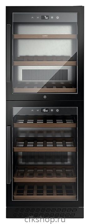 Винный шкаф CASO WineChef Pro 126-2D Black предназначен для хранения при оптимальных условиях бутилированного вина различных сортов в барах, ресторанах, специализированных магазинах, подсобных складских помещениях, а также в домашних условиях. Модель оснащена 2 независимыми холодильными камерами с распашными дверьми, длинными вертикальными рукоятками, прозрачными обзорными стеклами, внутренними сенсорными панелями управления и цифровыми дисплеями с белой подсветкой индикации. Корпус выполнен из стали с антикоррозийным покрытием черного цвета, полки – из массива древесины.