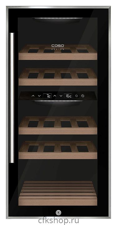 Винный шкаф CASO WineComfort 24 black предназначен для охлаждения и длительного хранения бутилированного и разливного вина в частных домах, квартирах, отелях и офисах. Модель оснащена 2 зонами хранения с независимой установкой температуры, сенсорной панелью управления c LED-дисплеем для каждой из них и 5 деревянными выдвижными полками. Дверная рама и ручка выполнены из нержавеющей стали, дверца - из трехслойного стекла с ультрафиолетовым фильтром.
