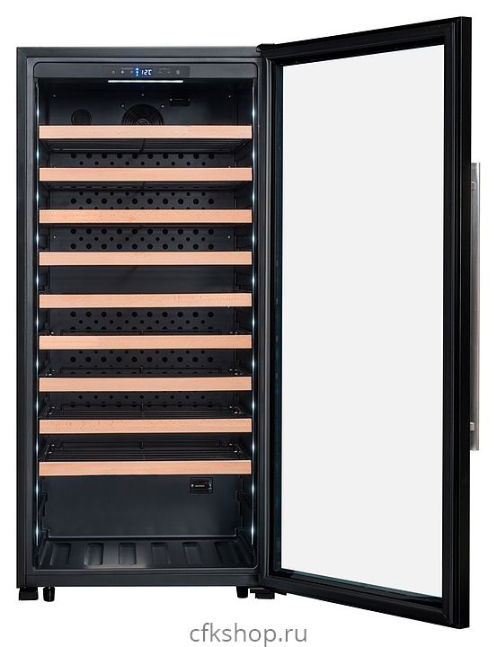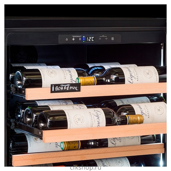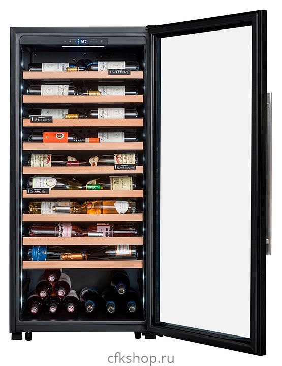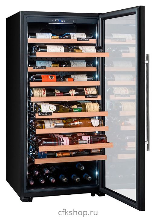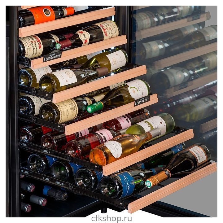 - Бутылки на полках лежат этикеткой к стеклу, что позволяет использовать винный шкаф не только для хранения, но и для демонстрации винной коллекции