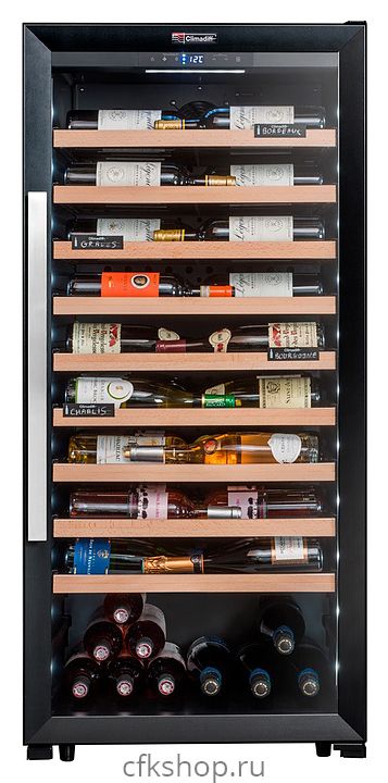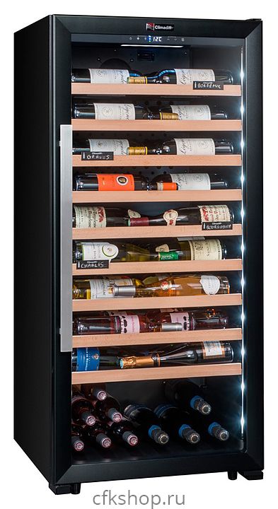 Винный шкаф Climadiff CPF100B1 предназначен для кратковременного хранения вина при определенном уровне влажности и температуры в ресторанах, специализированных магазинах, отелях, подсобных складских помещениях, в частных домах или квартирах и подготовки вина к подаче на стол. Модель оснащена сенсорным цифровым дисплеем, отключаемой внутренней подсветкой белого цвета и 2 транспортировояными роликами спереди, 2 регулируемыми по высоте ножками. Дверь выполнена из двойного закаленного стекла с защитой от УФ-лучей, полки - из натурального дерева с декором, ручка - из нержавеющей стали