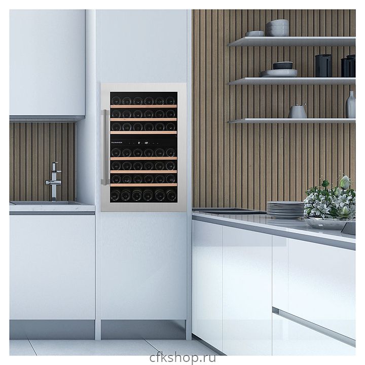 Винный шкаф Dunavox DAB-42.117DSS серии Built-in предназначен для демонстрации, хранения и создания оптимальных условий для сохранения всех вкусовых свойств вина в бутылках на предприятиях общественного питания, торговли, в барах, ресторанах, специализированных магазинах, частных домах или квартирах. Модель оснащена сенсорной панелью управления и LED-подсветкой синего цвета в каждой зоне. Корпус выполнен из окрашенного металла, дверь - из полированной стальной рамы и тонированного стекла с защитой от ультрафиолетовых лучей, выдвижные полки - из нелакированного бука, накладная ручка двери - из нержавеющей стали.