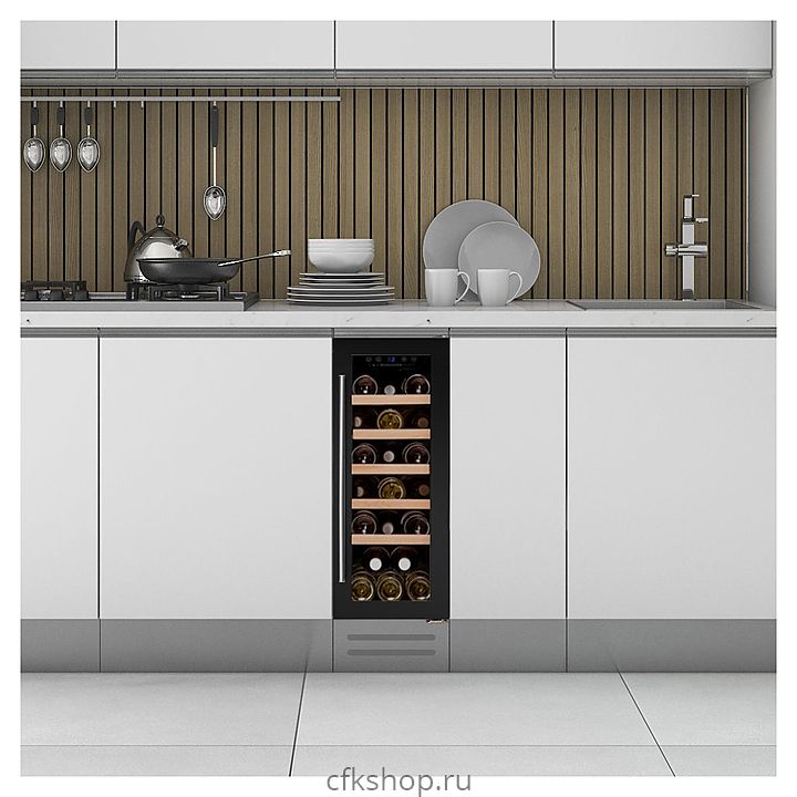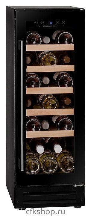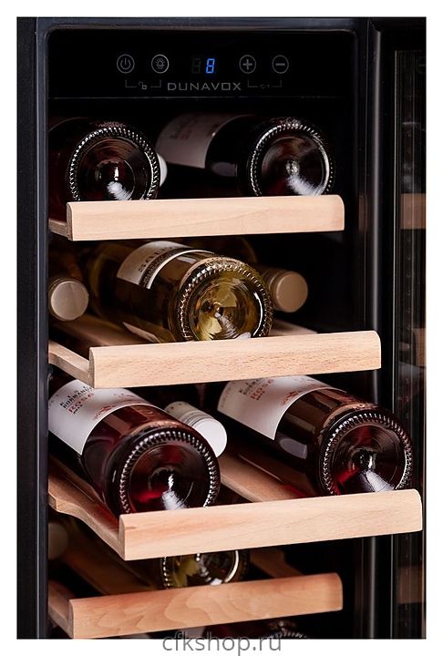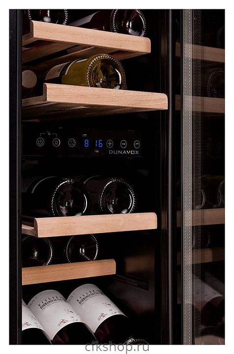 Винный шкаф Dunavox DAUF-19.58B предназначен для демонстрации, хранения и создания оптимальных условий для сохранения всех вкусовых свойств вина в бутылках на предприятиях общественного питания, торговли, в барах, ресторанах, специализированных магазинах, частных домах или квартирах. Модель оснащена сенсорной панелью управления и электронным термостатом. Корпус и ручка выполнены из стали, дверь - из рамы черного цвета и двойного тонированного стекла с защитой от ультрафиолетовых лучей, выдвижные полки - из массива бука.