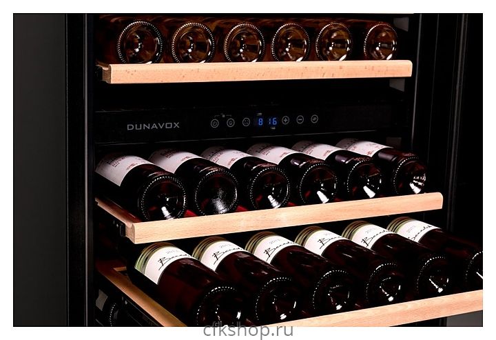 Винный шкаф Dunavox DX-166.428SDSK серии Exclusive предназначен для демонстрации, хранения и создания оптимальных условий для сохранения всех вкусовых свойств вина в бутылках на предприятиях общественного питания, торговли, в барах, ресторанах, специализированных магазинах, частных домах или квартирах. Модель оснащена сенсорной панелью управления и LED-подсветкой синего цвета в каждой зоне. Корпус выполнен из окрашенного металла, дверь - из бесшовной стальной рамы и тонированного стекла с защитой от ультрафиолетовых лучей, выдвижные полки - из нелакированного бука, накладная ручка двери - из нержавеющей стали.
