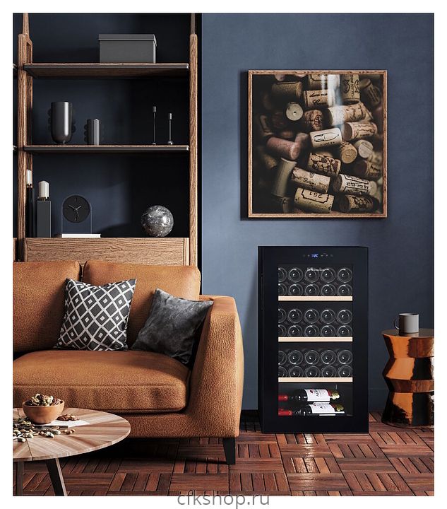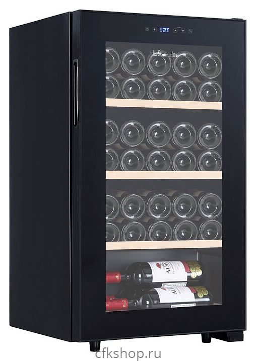 Винный шкаф La Sommeliere LS36BLACK предназначен для кратковременного хранения бутилированного вина в ресторанах, специализированных магазинах, подсобных складских помещениях, в частных домах или квартирах. Модель оснащена сенсорным цифровым дисплеем, подсветкой, 3 фиксированными полками, 1 фиксированной полуполкой, 2 регулируемыми ножками и 2 колесами. Дверь выполнена из стеклопакета с защитой от УФ-излучений, полки - из натурального дерева.