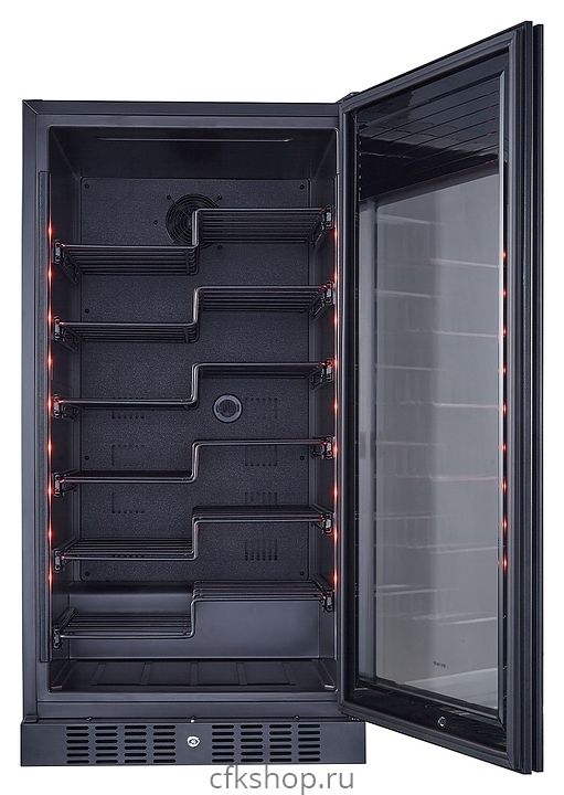 В комплект поставки входят 6 полок с направляющими для размещения бутылок, ключ от дверного замка и инструкция по эксплуатации.